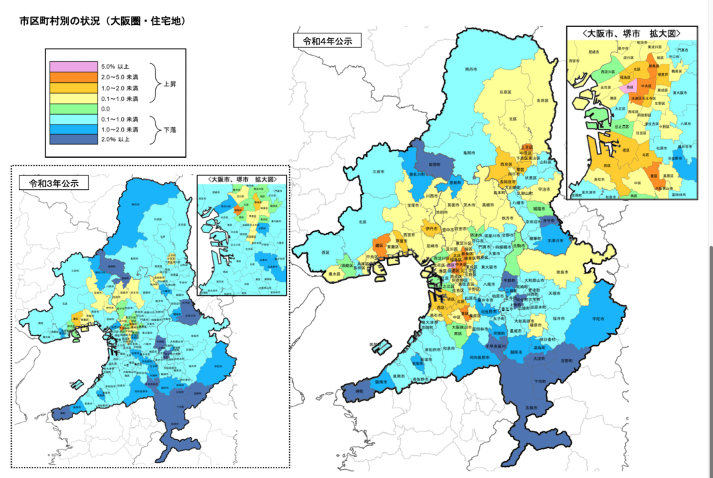 大阪府の多くの地域で地価は下降傾向にありますが、大阪市北区・福島区と並んで地価が上昇しているのが豊中市・箕面市・吹田市・茨木市・高槻市といった北摂エリアになります。国土交通省が発表した「令和4年地価公示」の資料でも