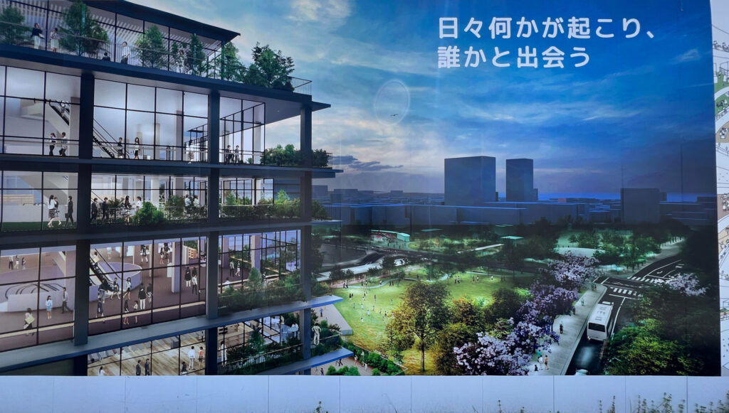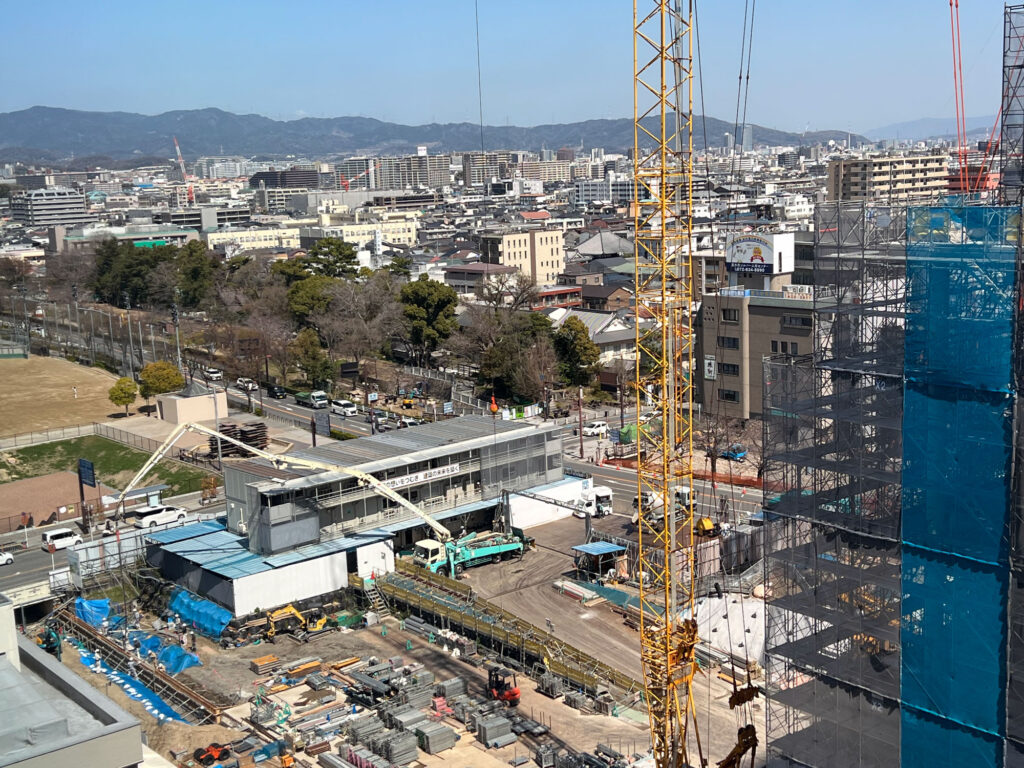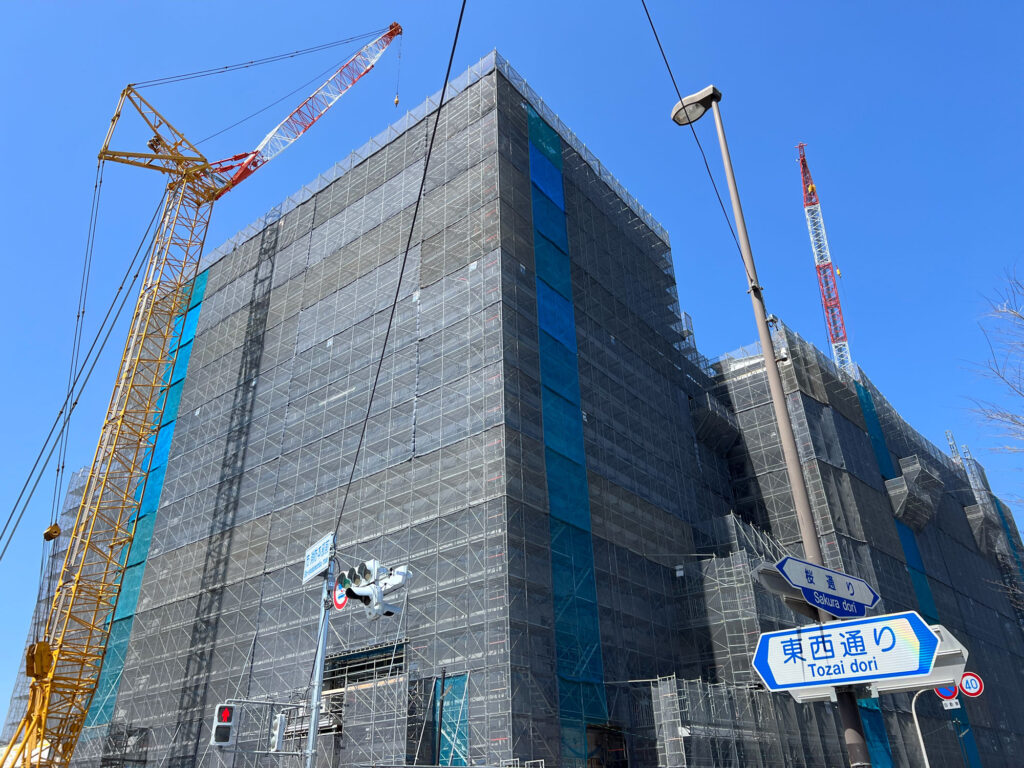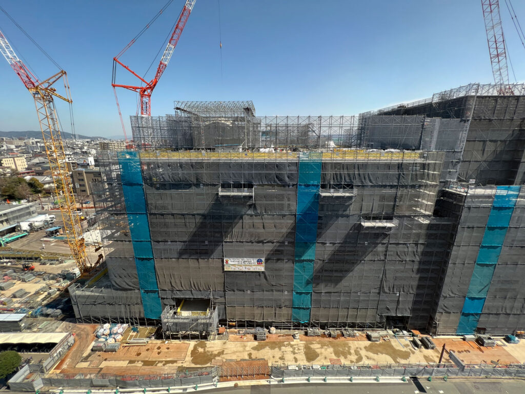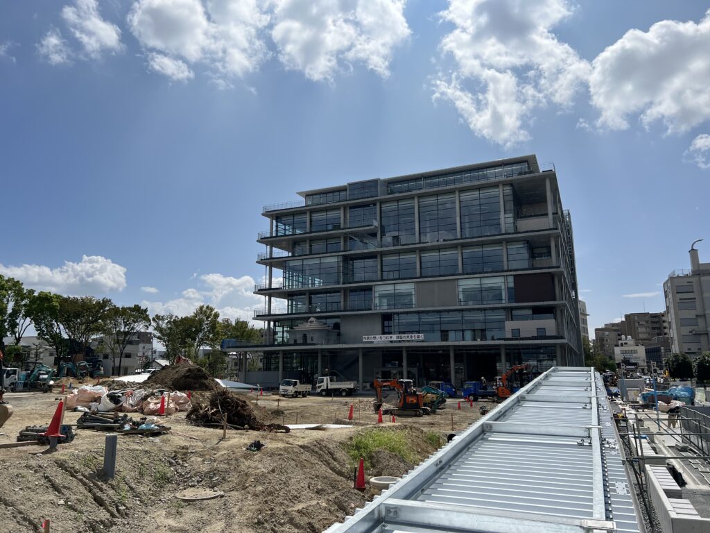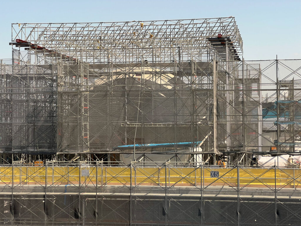 工事の足場に囲まれていて、施設の外観などは分かりませんでした。工事車両がひっきりなしに出入りしていたり、施工の音が鳴り響いていて、11月の完成に向けて職人の皆さんが一生懸命作業されているのが分かりました。