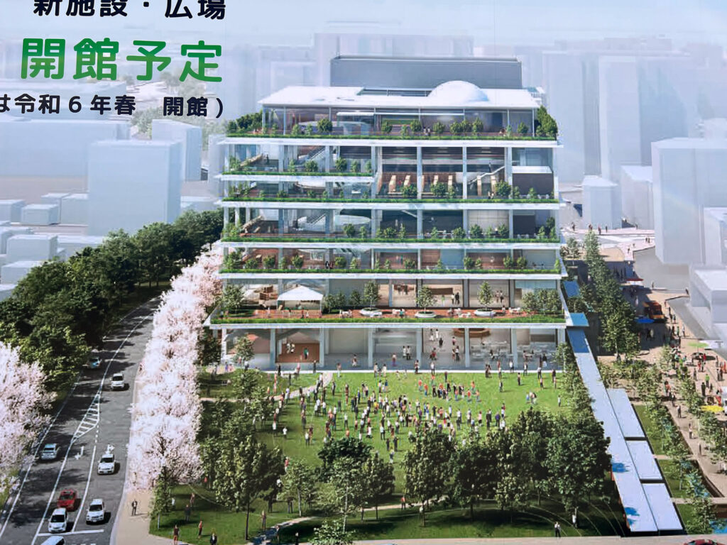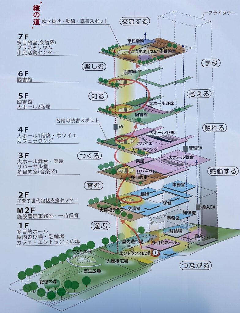 7階建ての施設には「ホール」「図書館」「子育て支援」「プラネタリウム」「市民活動センター」など様々な機能が集約されており、ガラス張りで壁を少なくした建物には自然の光が溢れる開放的な空間となるそうです。