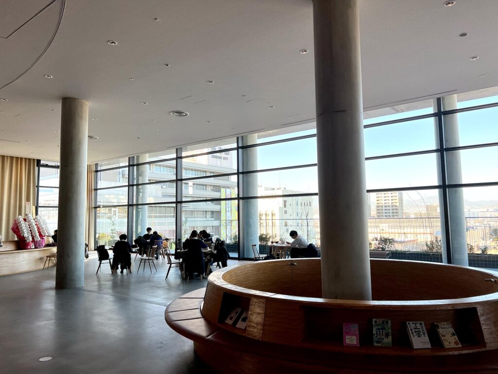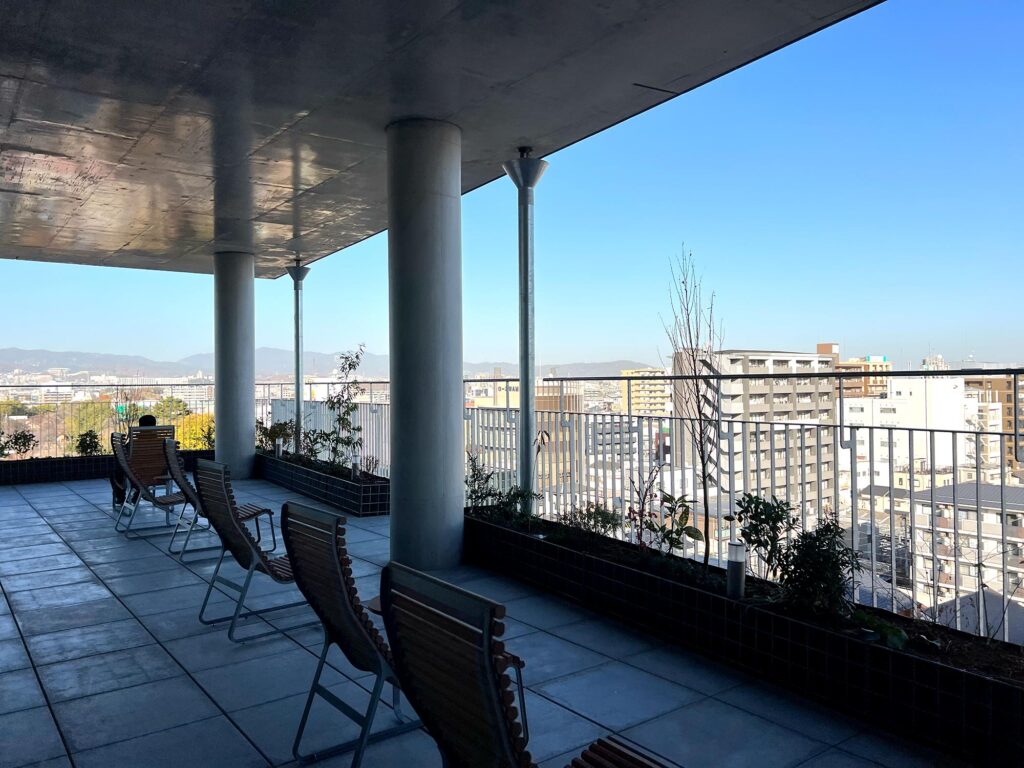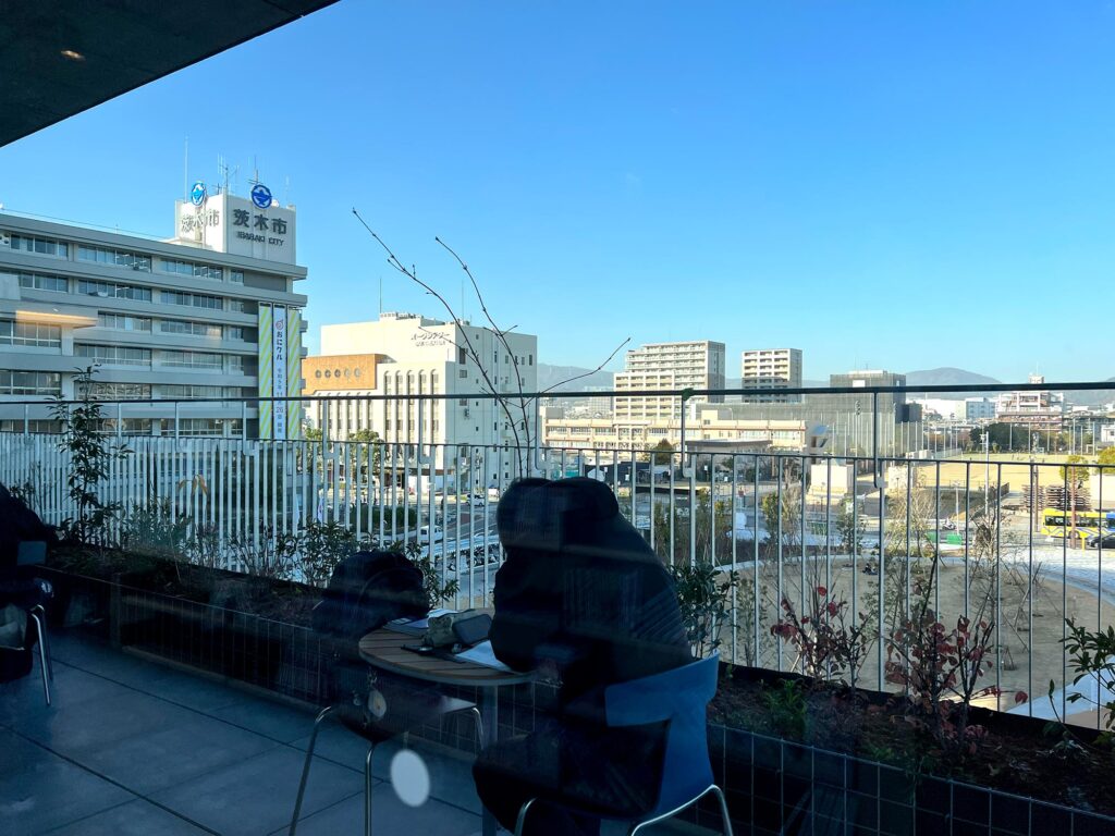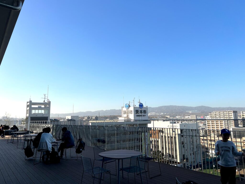 7階のテラスは他の階に比べて大きくて、机なども置かれていました。茨木市を一望できるので、晴れた日はとても気持ちの良い空間です。
