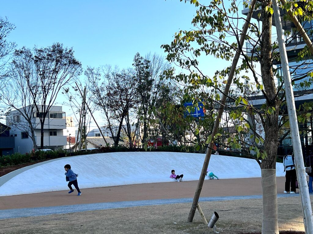 芝生広場の一角には、このような石の滑り台?のようなものも。小さなお子様であれば、ここだけで十分楽しめそうです。