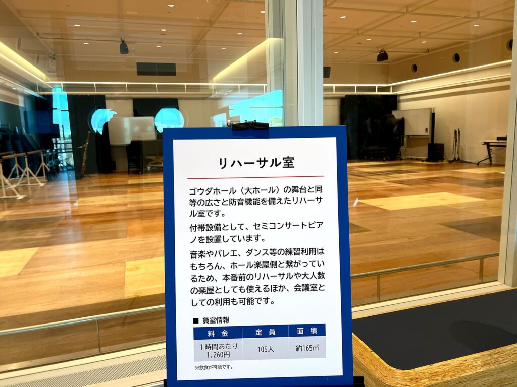 ゴウダホールの舞台に近い大きさと防音機能を備えたリハーサル室。音楽やバレエ、ダンス等の練習利用はもちろん 、直接楽屋側にアクセスできることから、 ホール本番前のリハーサル利用や 、大人数での楽屋としても使えます。椅子、机を並べることで会議室利用も可能。