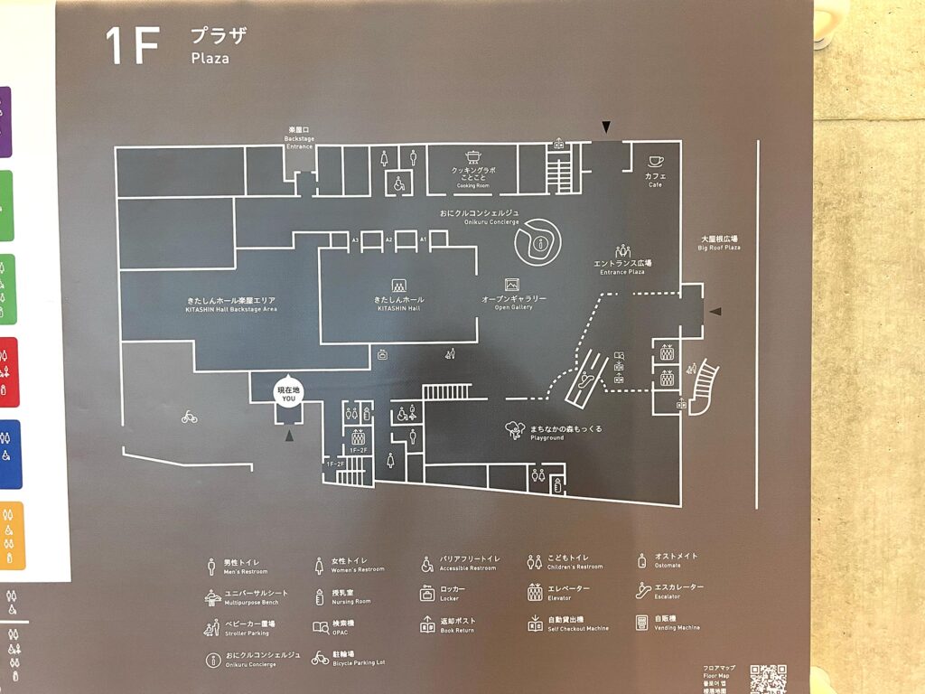 1階には「エントランス広場」「オープンギャラリー」「カフェ」「まちなかの森もっくる」「クッキングラボ」「コンシェルジュ」「きたしんホール・楽屋」があります。
