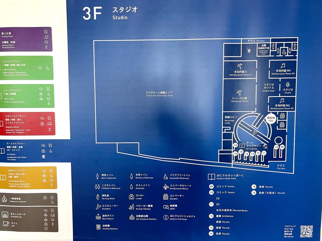 3階には「ゴウダホール(楽屋エリア)」「リハーサル室」「アートライブラリー」「多目的室」「音楽スタジオ」「音響 映像制作室・録音室」があります。