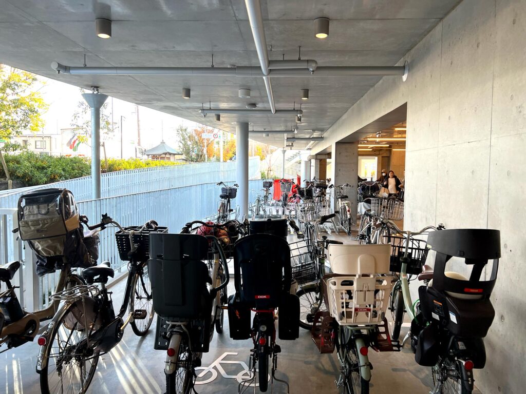 1階の駐輪場もそこそこの広さがあり、平日であれば余裕を持って止められると思います(休日は厳しいかも)。電動自転車専用の駐輪場所も用意されているのがママさんに嬉しいポイントですね!料金も無料でした。