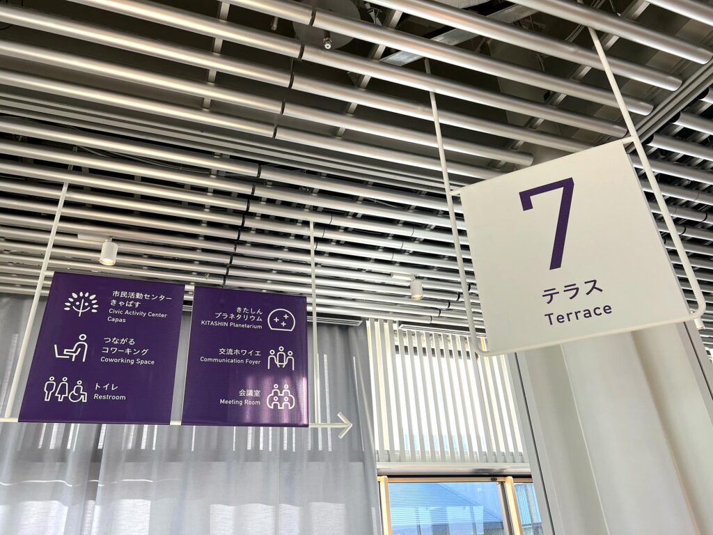 7階には「市民活動センター きゃぱす」「コワーキングスペース」「市民交流スペース」「きたしんプラネタリウム」「屋上広場・交流ホワイエ」「会議室」「和室」があります。